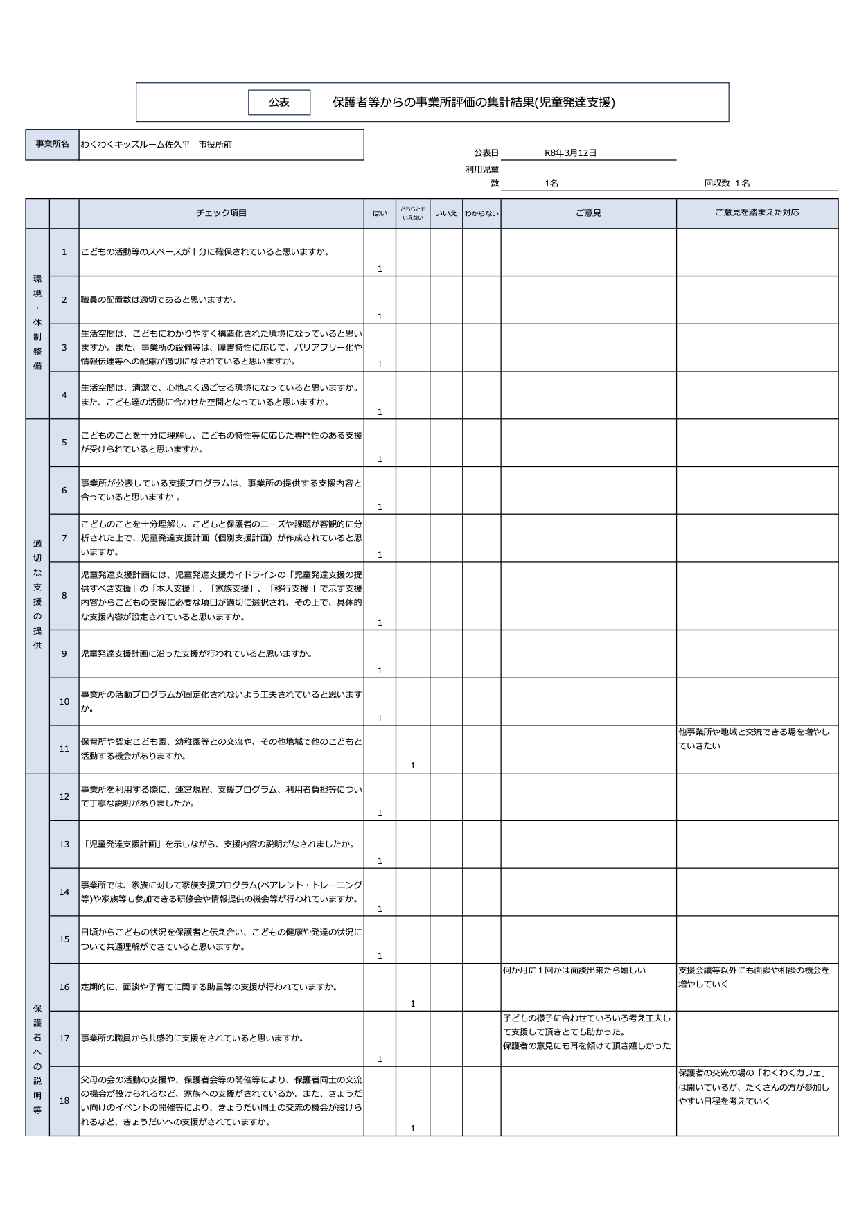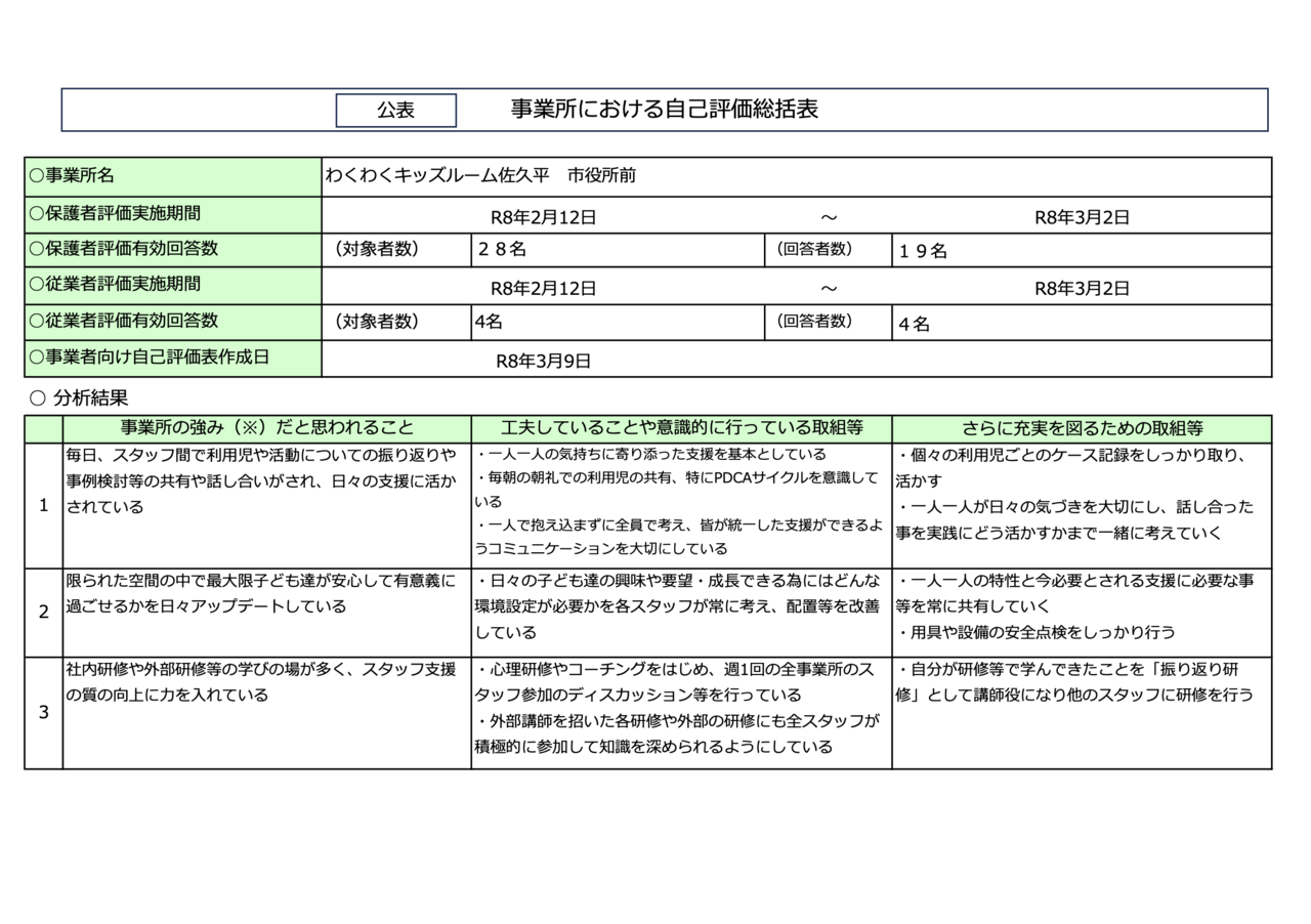 令和7年度児童発達支援事業所「わくわくキッズルーム佐久平 市役所前」自己評価表結果等について